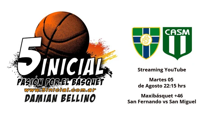 Esta noche desde las 22:15 horas, en vivo con la transmisión de 5inicialPlay, choque de santos por el Torneo +46 B de FeBAMBA: San Fernando vs San Miguel.